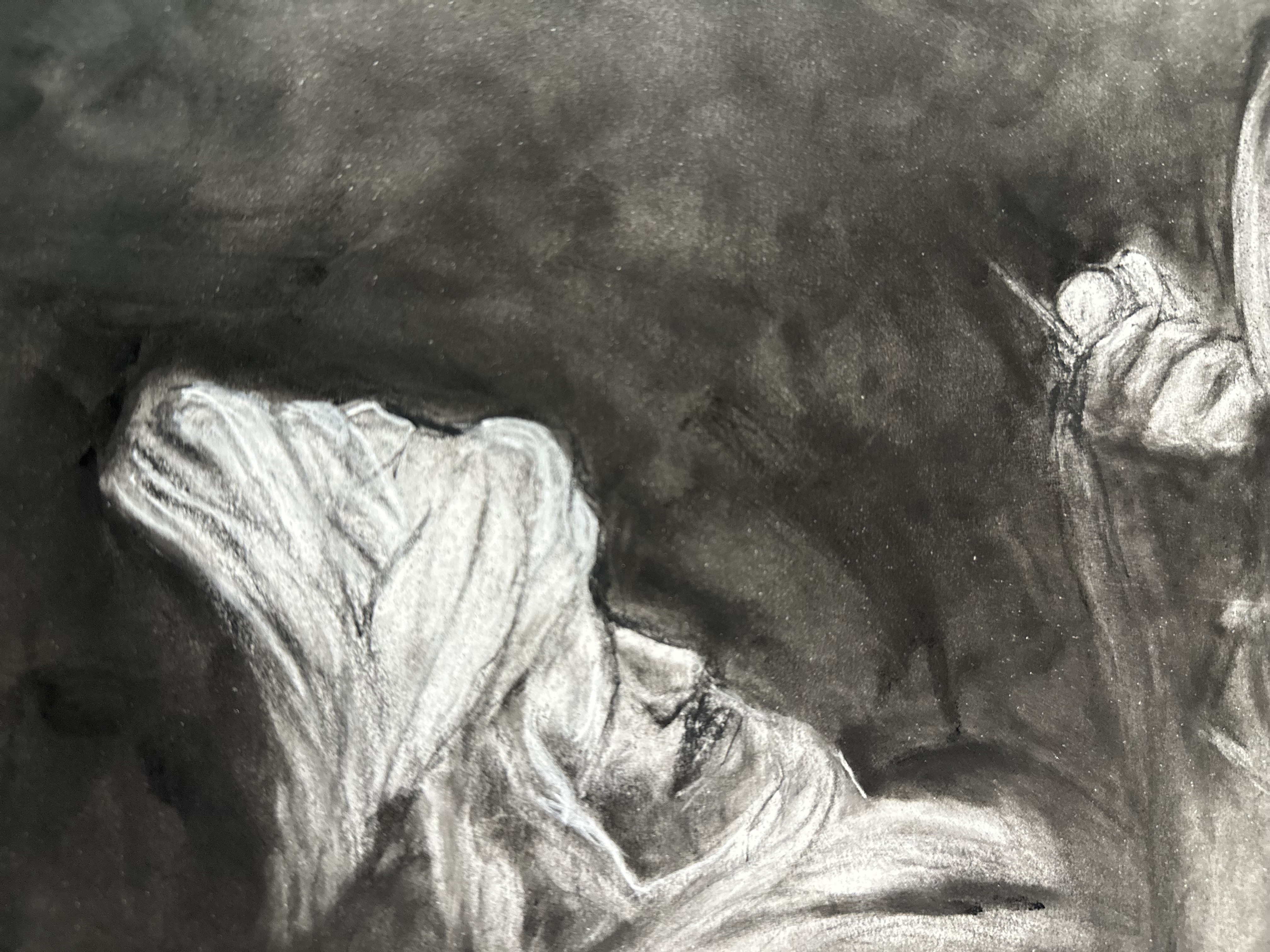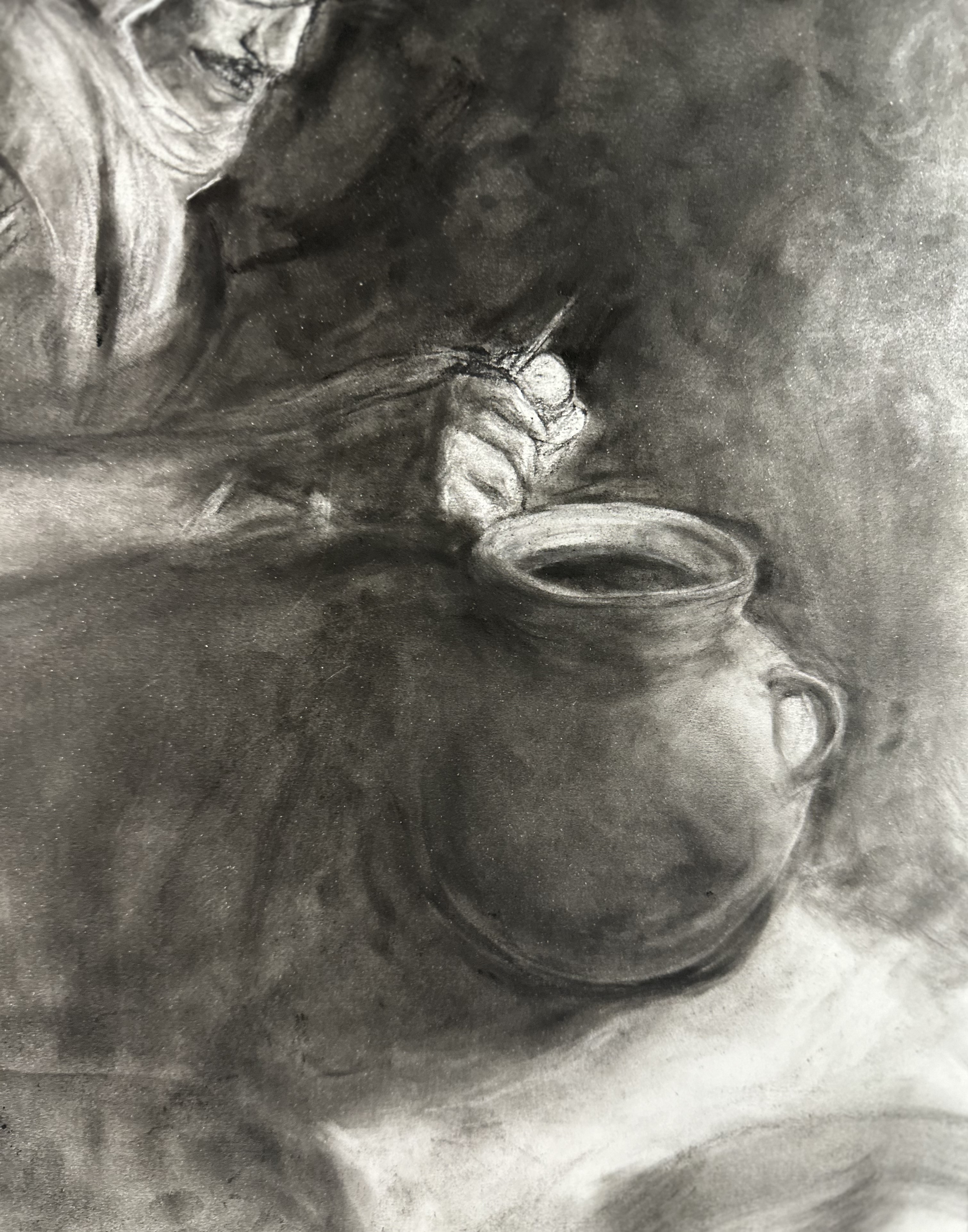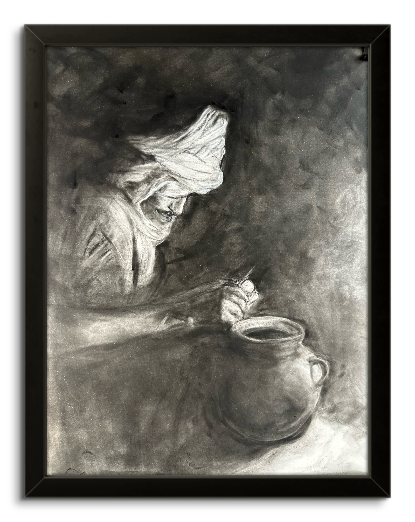 Charcoal, pan pastel black on paper In order to create a serene moment in the desert, I focused on the cook’s white head scarf and his hand peeling the potato. Also the metal pot plays a role of giving the atmosphere of the night camp scene.