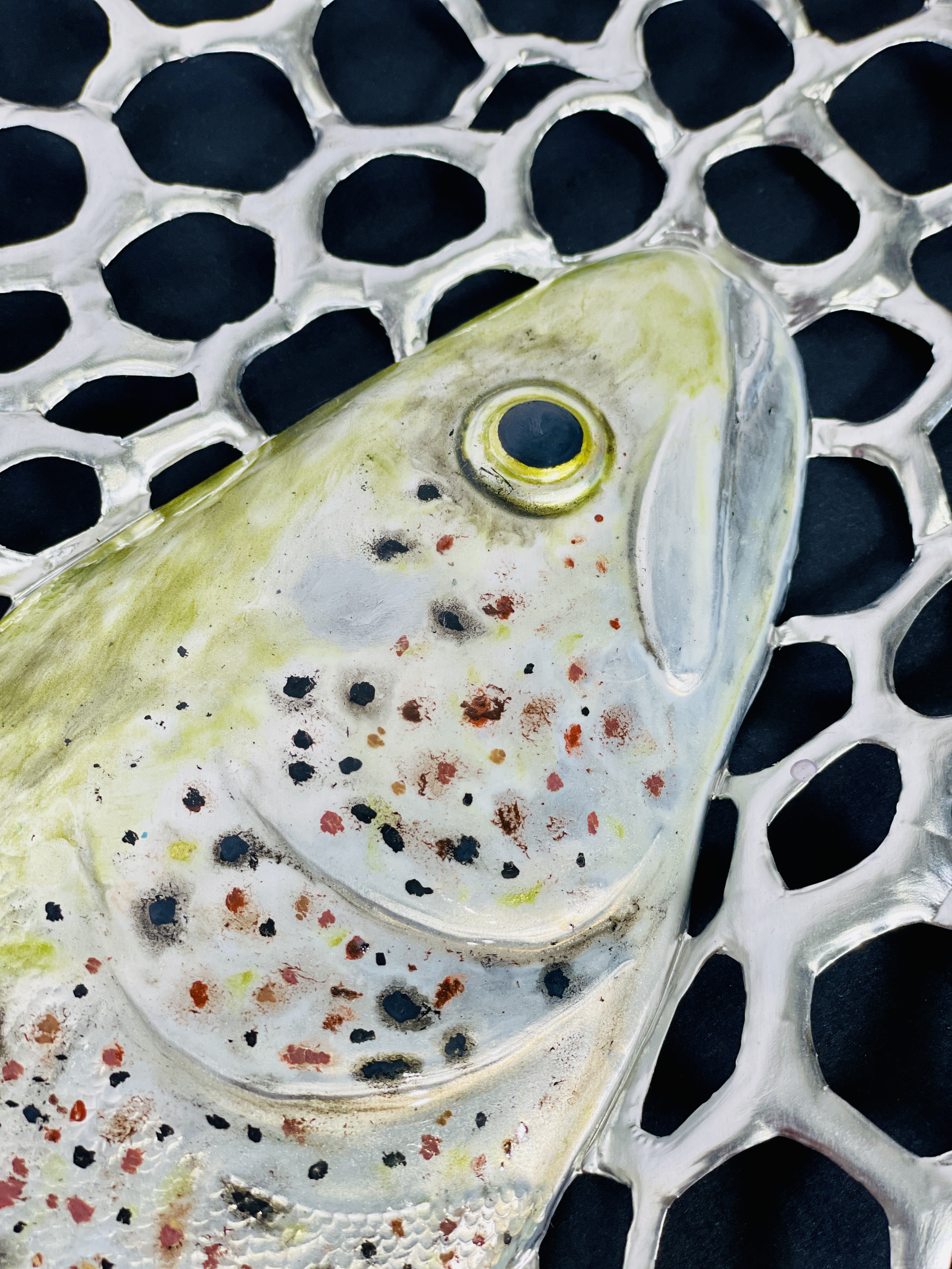 Sbalzo e cesello a mano su alluminio, resina e pigmenti