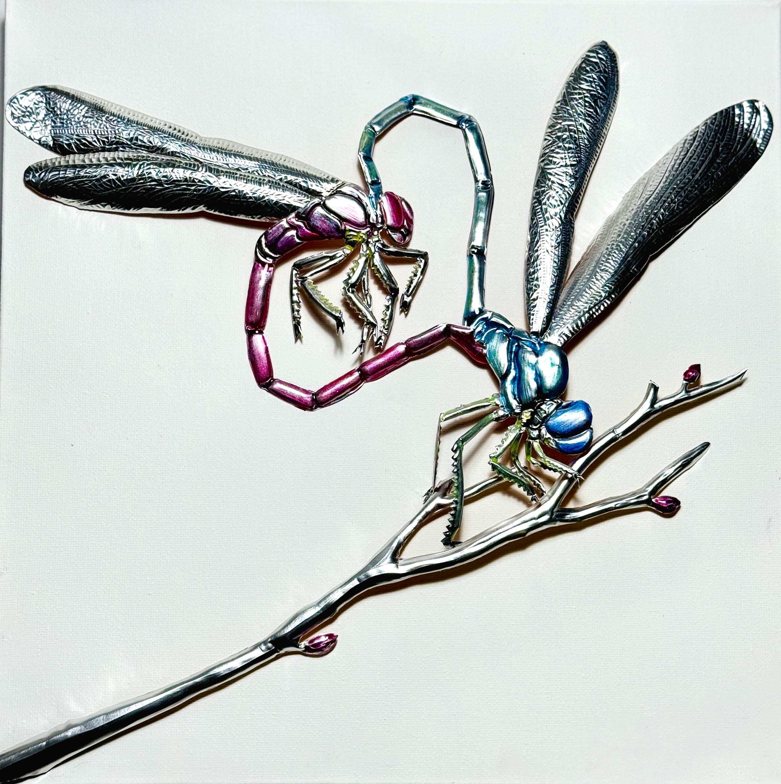 Sbalzo e cesello a mano su alluminio, resina e pigmenti
