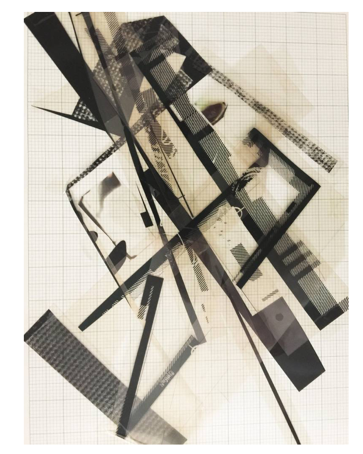 This is a film collage, utilizing film scraps from production art for screen printing. The pieces are arranged in a contemporary composition. The art is black and white with gradients and patterns. Film, tape on paper.