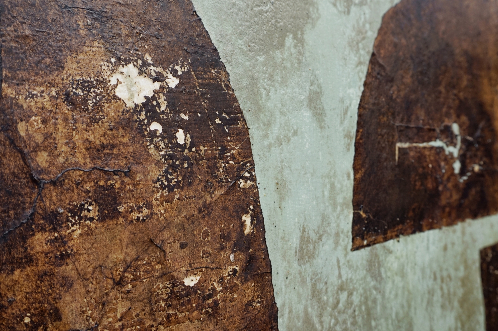 Painting on canvas. Mixed media. Collage Mediums and materials: acrylic, plaster, household paint, enamel, bitumen of judea,... Organic texture.