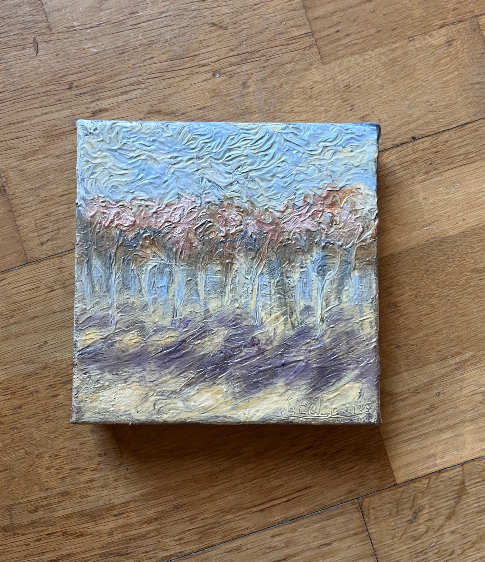 Oil on Linen The swirling sky and layered colours evoke both calm and mystery, inviting you to feel the quiet energy of the grove. This piece brings a soothing yet dynamic presence, perfect for inspiring reflection and tranquility in any space.