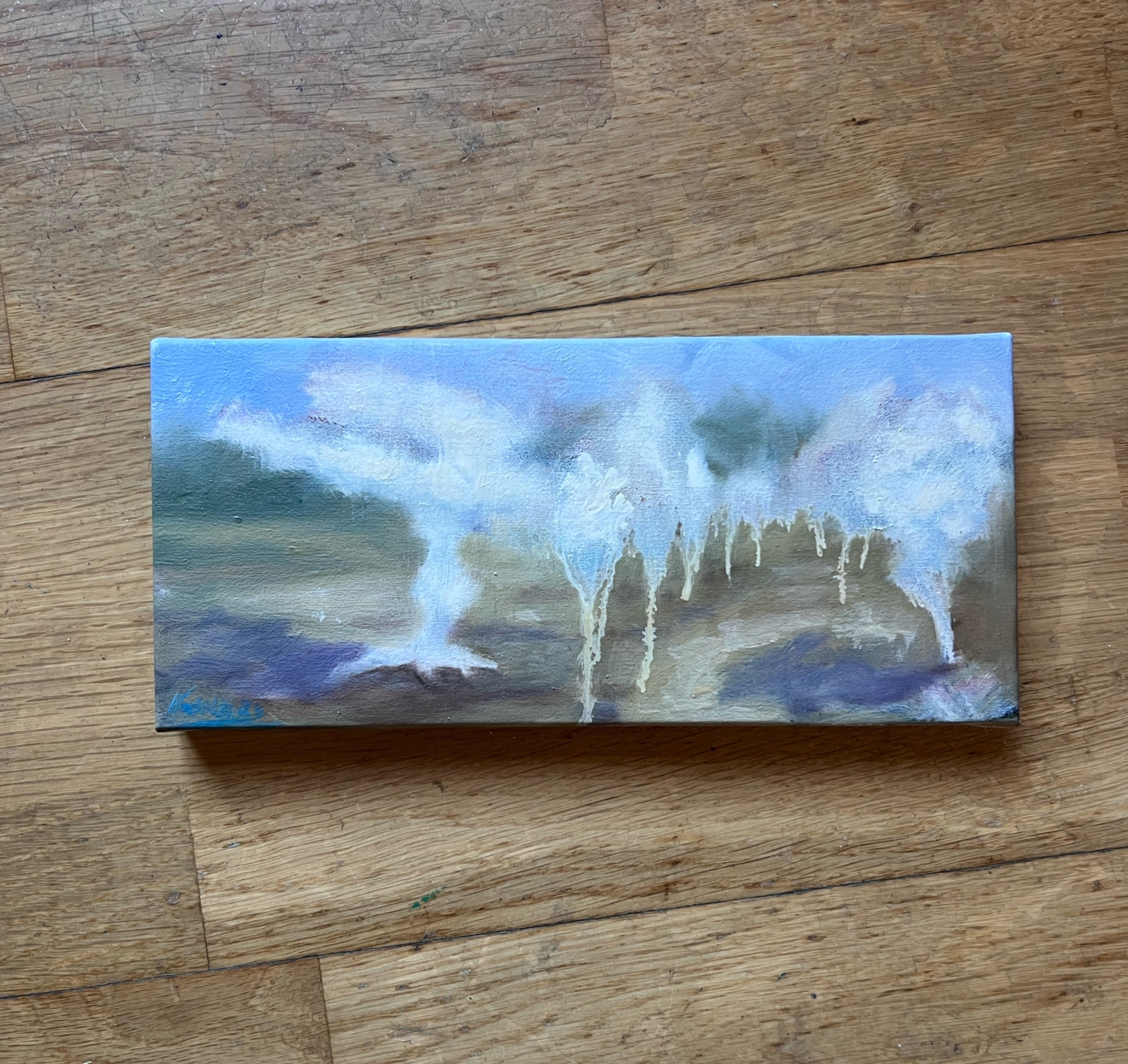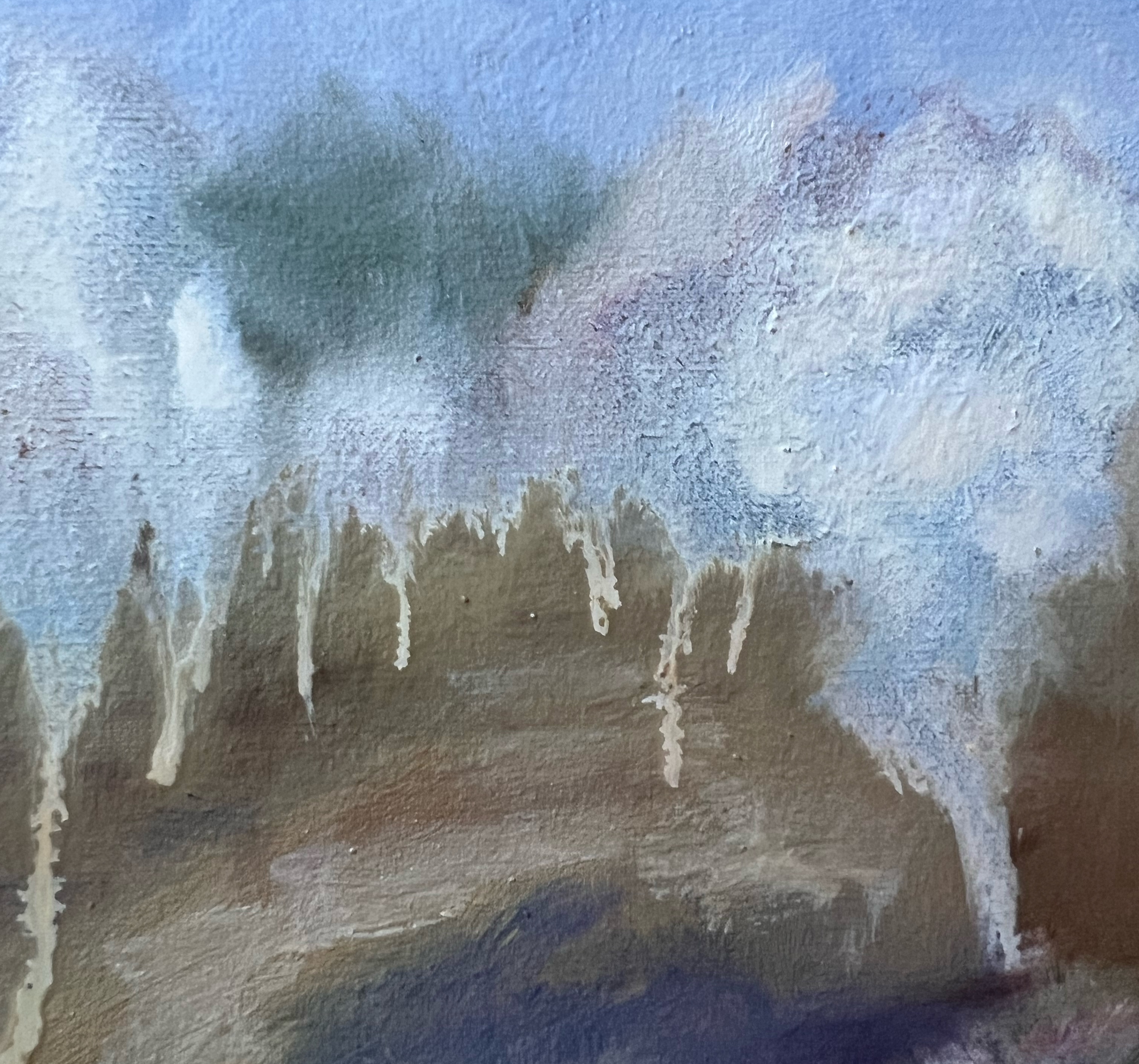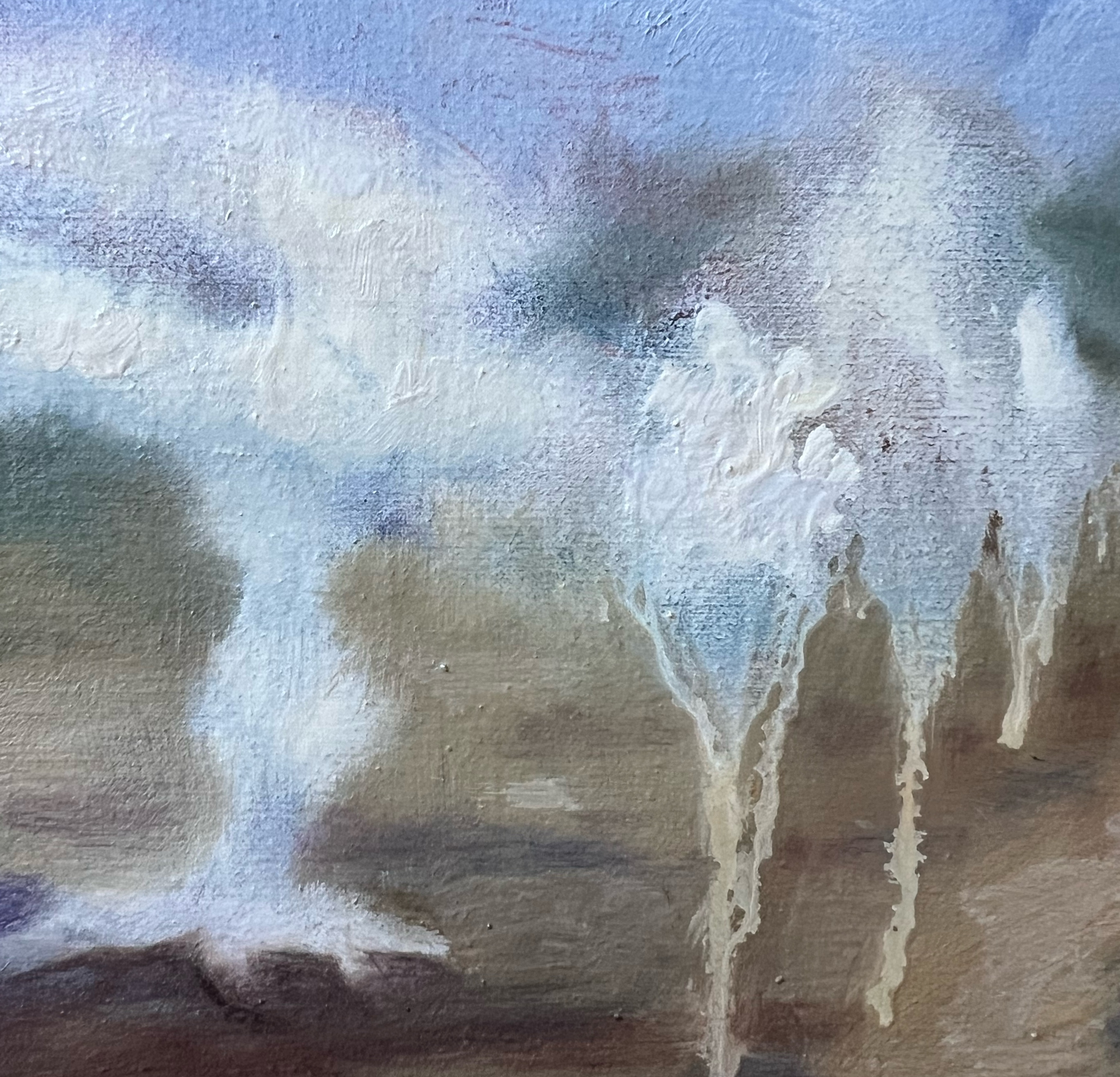 Oil on Linen Mist and delicate drips, blending abstract and surreal forms to evoke a dreamlike landscape. The soft blues and muted earth tones invite calm and introspection, infusing your space with a peaceful, otherworldly energy.