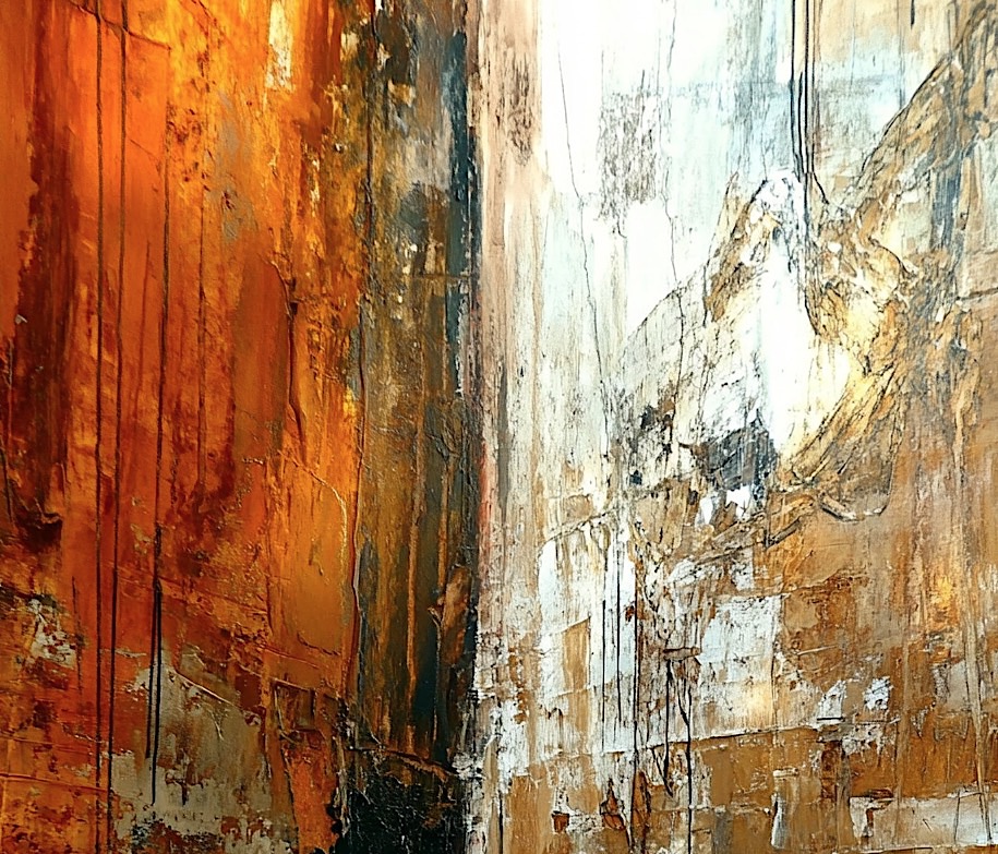 Acrylic paints with texture additives to create depth and dimension, along with the use of bold brushwork and linear elements for contrast.