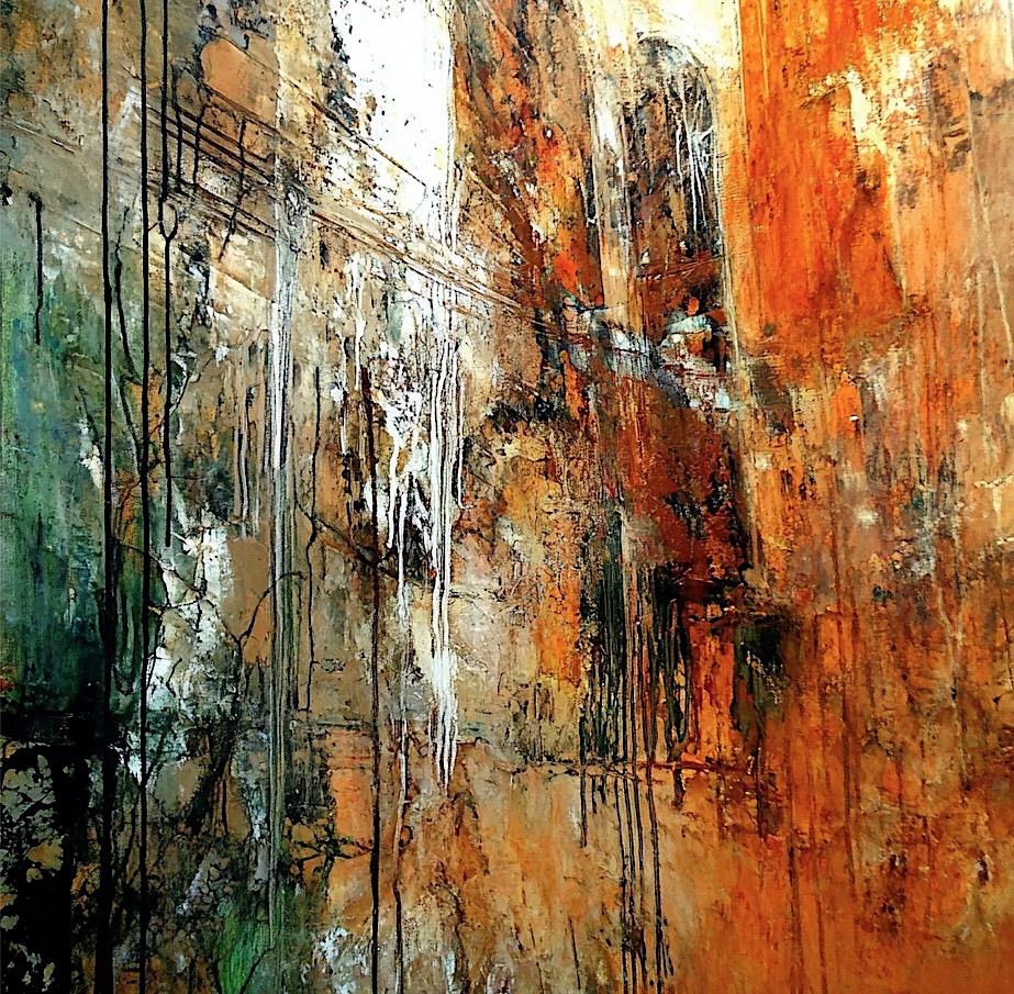 Acrylic paints with texture additives to create depth and dimension, along with the use of bold brushwork and linear elements for contrast.