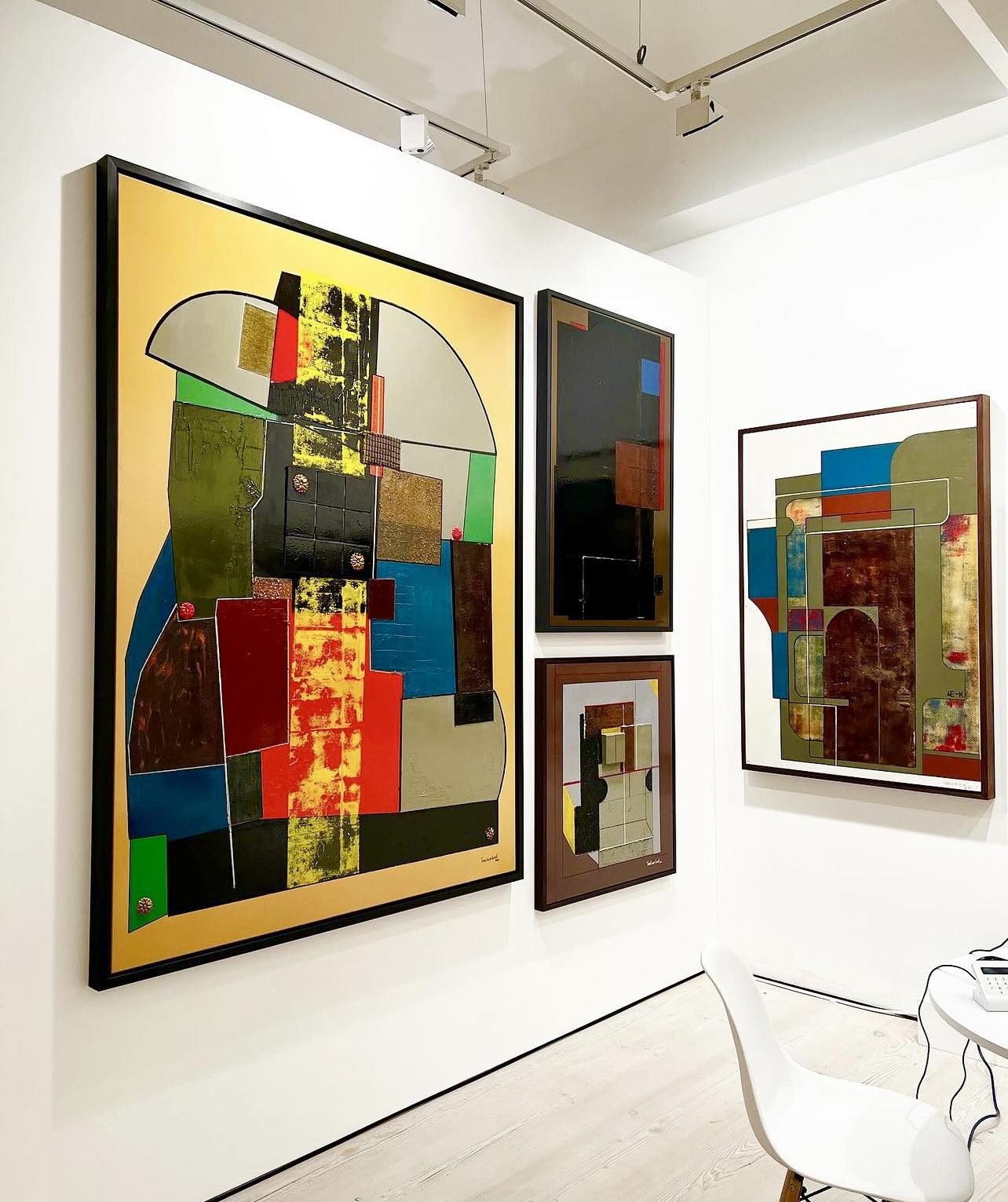 Mix media, objects fixed, textiles, tiles, sand, copper powders. Framed