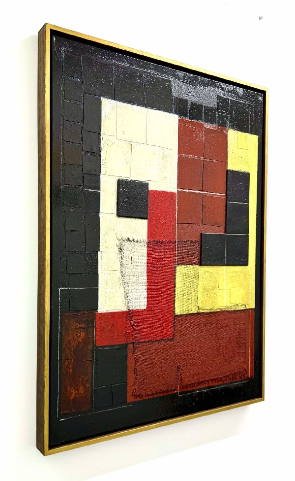 Mix media, tiles, textiles, leather squares, cement on canvas, framed