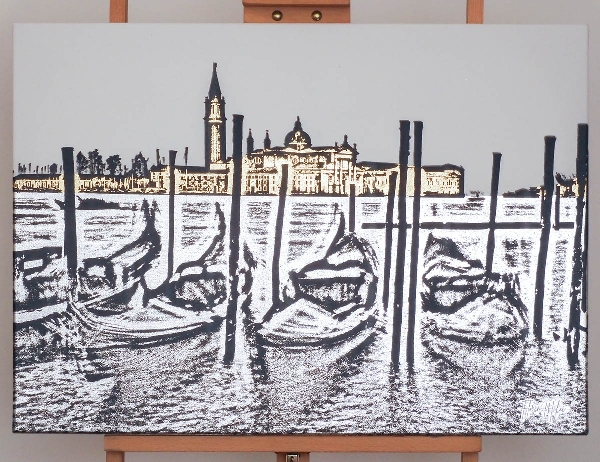 Black ink, gold and silver foil, stretched canvas.