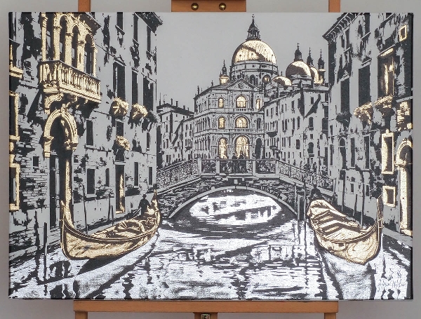 Black ink, gold and silver foil, stretched canvas.