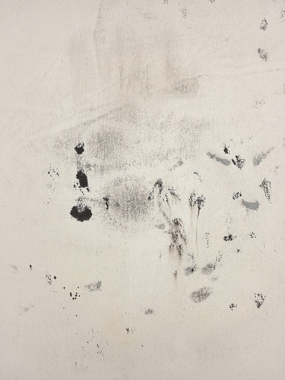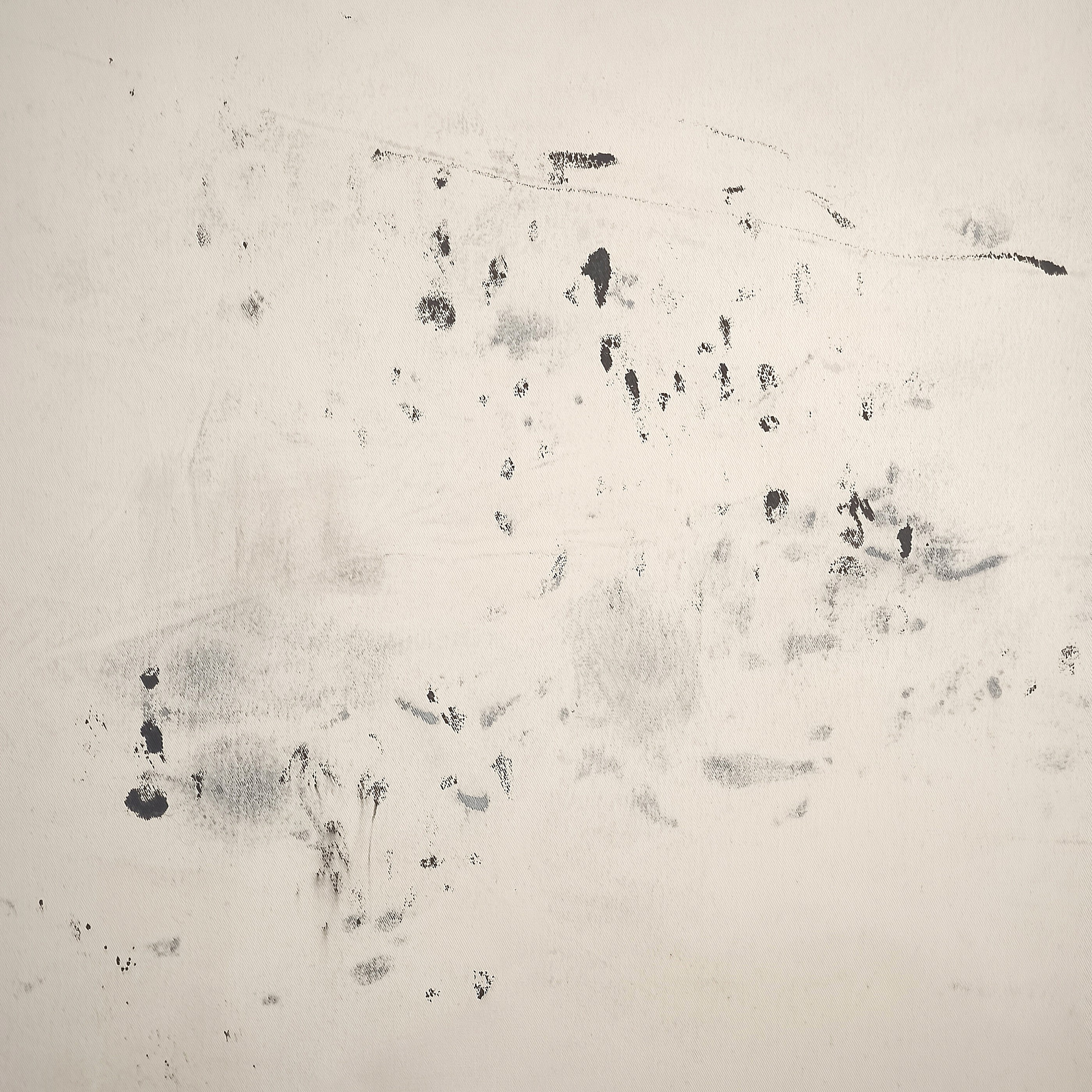 Encre, apprêt sur toile écrue tissée fin tendue sur châssis costaud en bois PEFC de 65/25 avec 2 traverses. Agrafes à l\'arrière. Ce travail est fait par impression et par le geste de la peinture