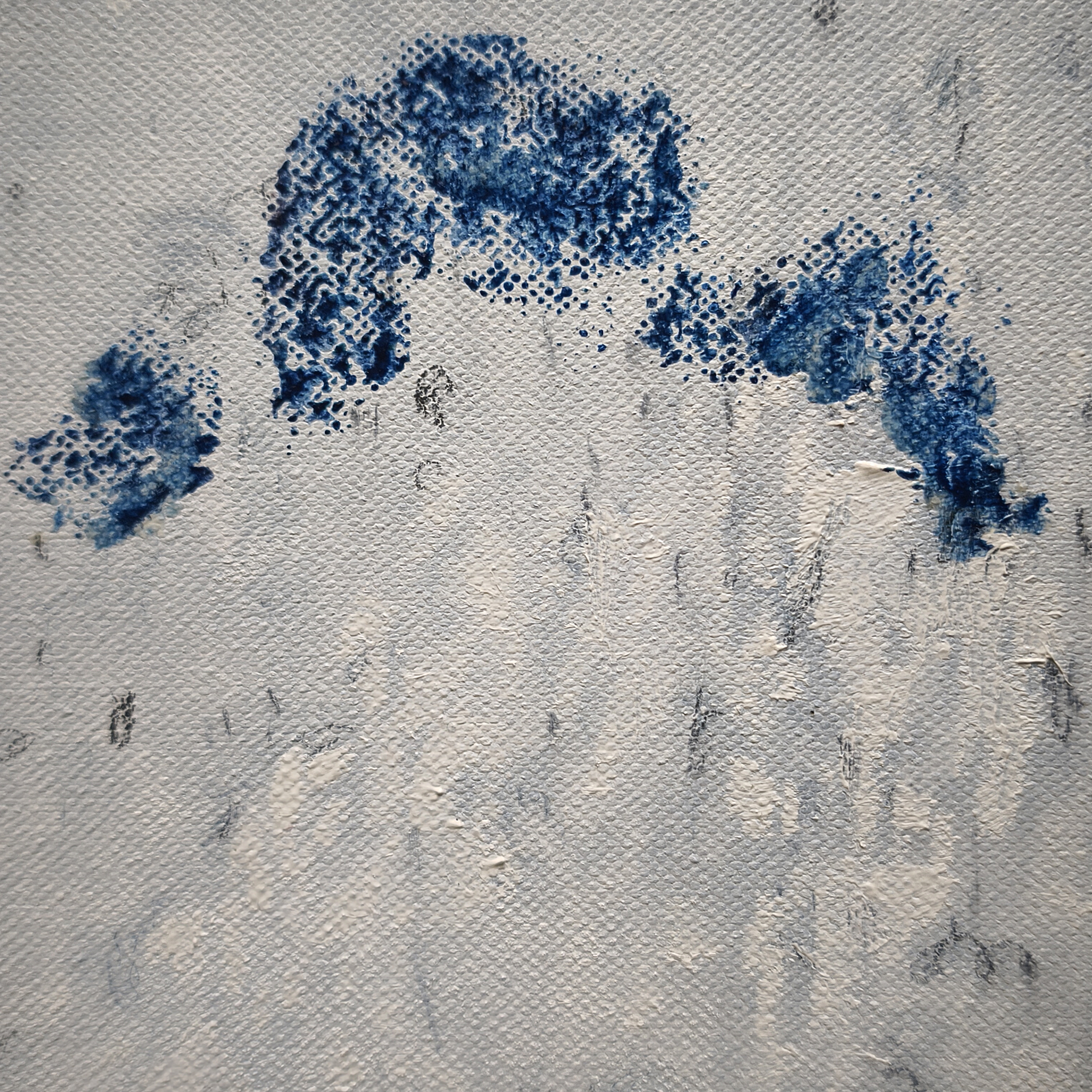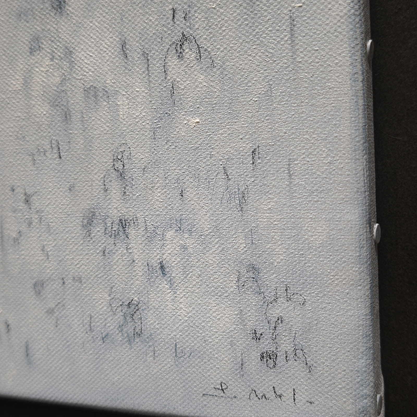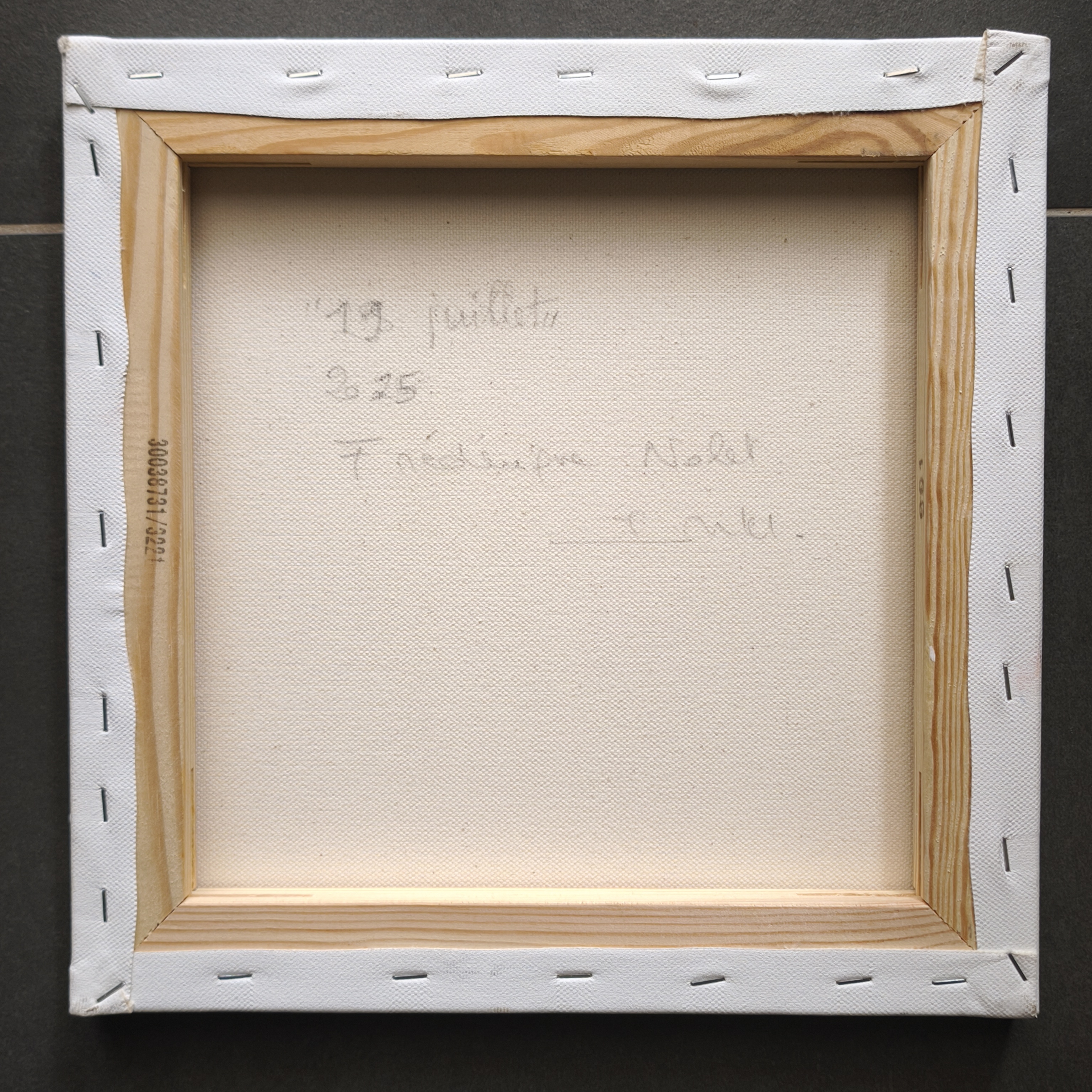 Technique mixte sur toile dont peinture à l'huile. Clous sur les côtés. Epaisseur du châssis : 1,8 cm. Je peux ajouter un encadrement de bois peint en blanc comme pour les autres oeuvres de 30x30cm (et des coins à l'arrière du châssis)