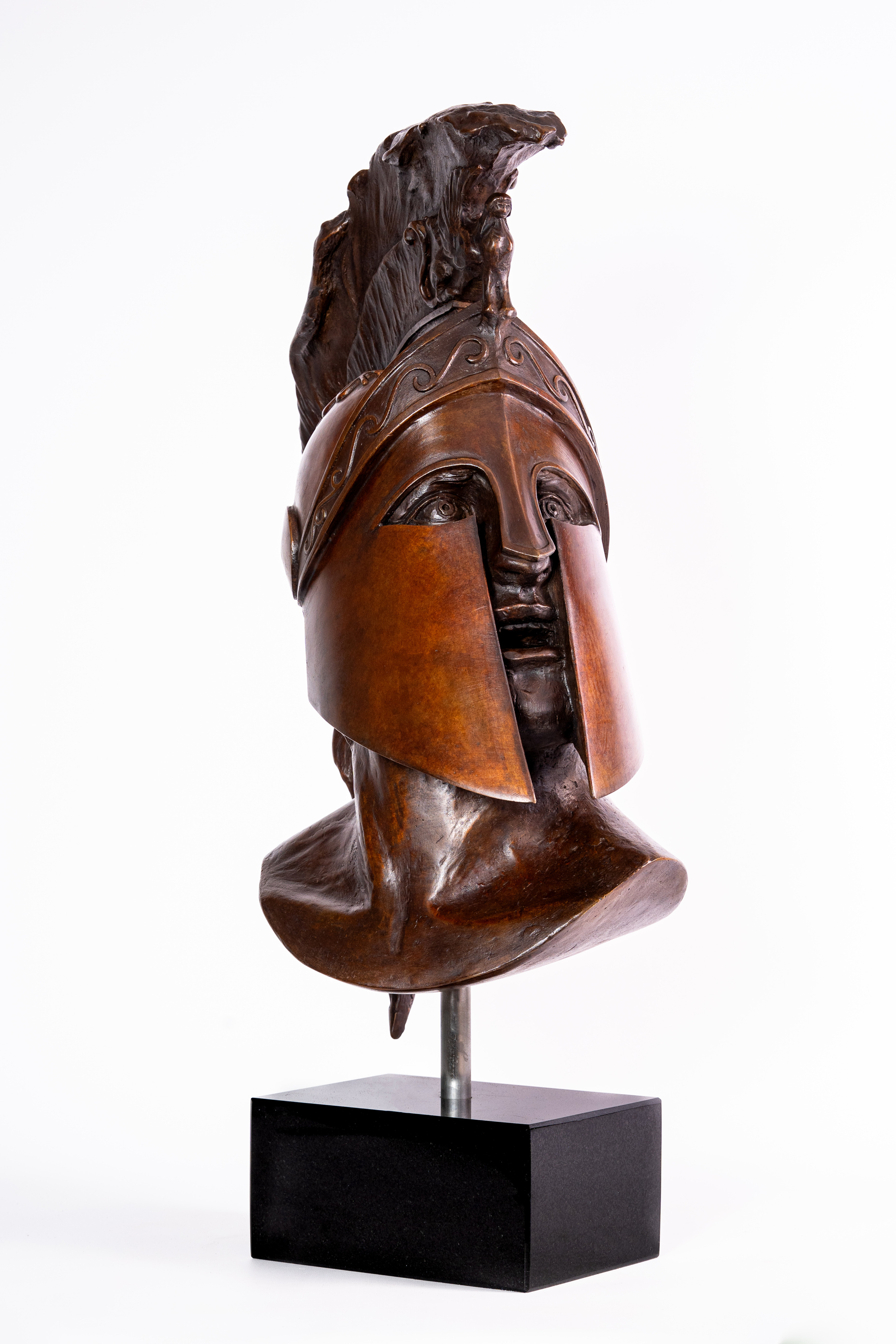 Perseus' Corinthian helmet is the main element in this portrait bust of the Greek mythological character. Cast in bronze and mounted on a black granite base. 2/9. 12 weeks from confirmation of order to dispatch for shipping.
