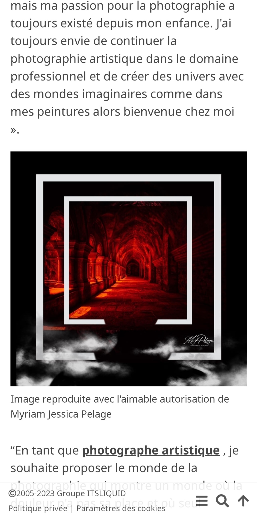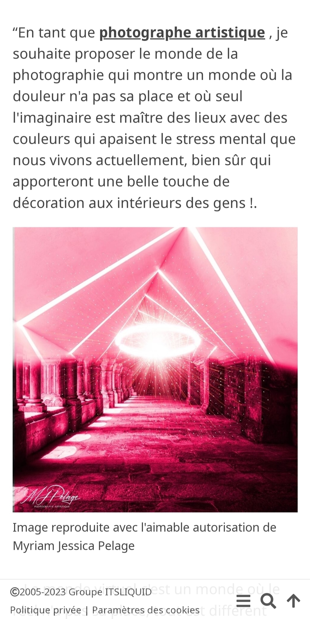 Touchée par une maladie auto-immune, Myriam Jessica Pelage transforme la peinture et la photographie en un exutoire vibrant. Elle fusionne des clichés réels et légaux à des logiciels avancés pour tisser des mondes oniriques, reflet de son âme artistique. Ses œuvres évoquent un voyage immersif dans l'introspection, explorant le courage et la paix intérieure. A travers ses créations, elle nous invite à allumer notre propre lumière, guidant vers une ascension personnelle au-delà des défis du quotidien.